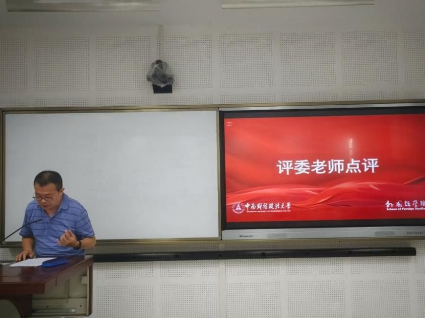 宣讲结束后,袁经林老师对比赛进行了点评。他首先肯定了选手们通过视频等多元形式展现党史故事的创新做法,认为这种立体化表达让党史宣讲更鲜活、更具感染力。同时,袁老师提出两点建议:一是建议在故事讲述中加强与当下时代的关联,结合外语专业的国际传播使命,进一步凸显红色精神的当代实践价值,让故事“活”在当下;二是希望作为语言专业的选手们进一步提升语言表达能力,在保留情感温度的基础上,用更精准的表述强化观点输出,让宣讲既能以情感人,又能以理服人。