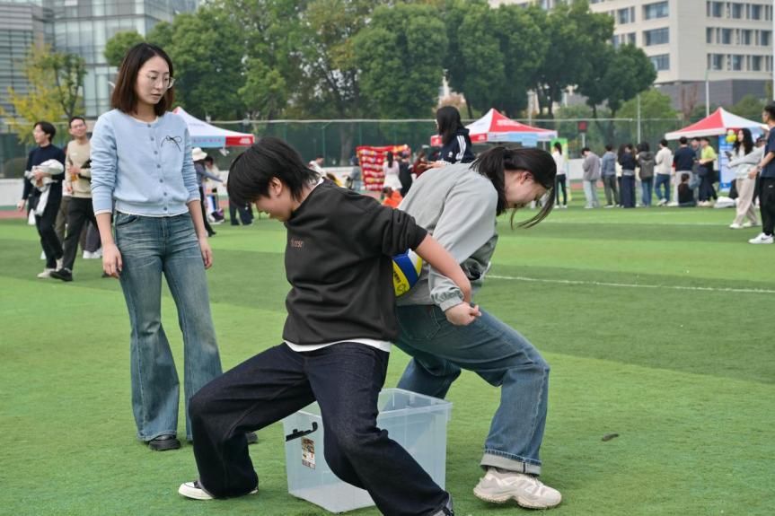 赛场上,选手们随机组队、默契配合,步调一致、稳步前行,在短时间的磨合中展现出良好的团队协作与拼搏精神。开元(中国)研究生踊跃参与,在竞赛中奋勇争先,展现了顽强拼搏的运动风貌,彰显了外院学子的昂扬精神与青春风采。现场欢声笑语与加油呐喊此起彼伏,汇成一片洋溢着青春活力的运动海洋。