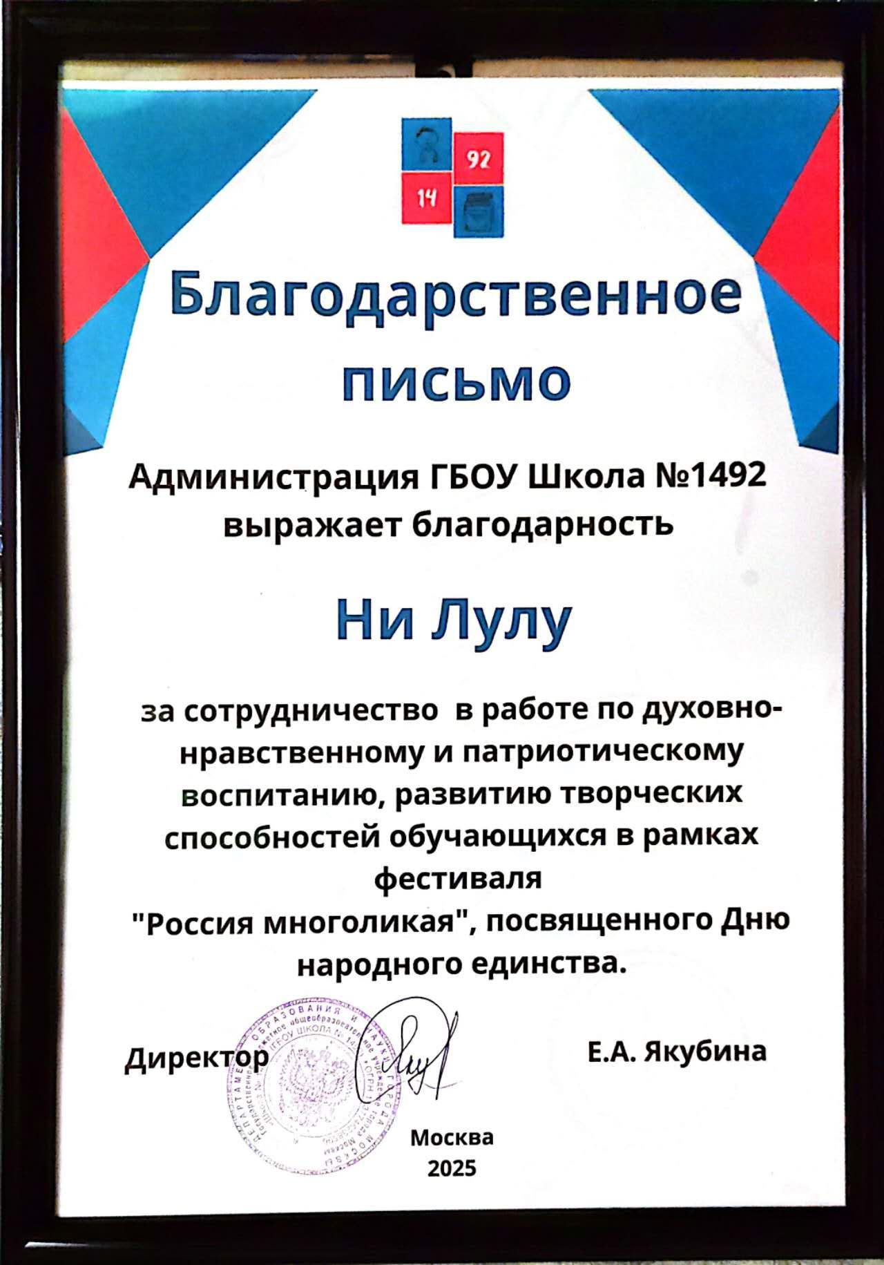 (通讯员 倪璐璐)2025年11月6日,“多元俄罗斯”校园艺术节比赛在莫斯科市国立第1492学校盛大开幕,我院教师倪璐璐受邀担任国际评委。“多元俄罗斯”校园艺术节以丰富多彩的艺术形式展现了俄罗斯联邦各民族文化的独特魅力与深厚底蕴。这不仅是一场比赛,更是一项具有原创性的创新项目,艺术节共征集并上演了126个精彩节目。内容涵盖诗歌朗诵、民族歌舞、传统乐器演奏、艺术体操表演等多种形式,来自莫斯科各个学校的学生们用俄语及汉语生动地演绎了俄罗斯的多元文化图景,奉献了一场绚烂的文化盛宴。